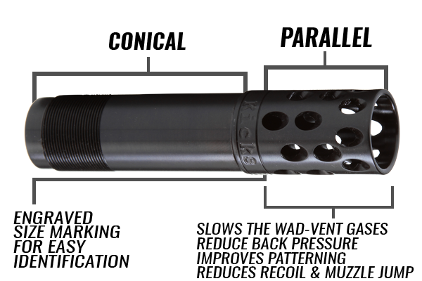 Our unique conical/parallel internal design, together with our exclusive outward angled diagonal ports improve patterns by up to 20% in increased density. Our ports also reduce muzzle jump and felt recoil giving you faster, more accurate, and more comfortable follow up shots.
