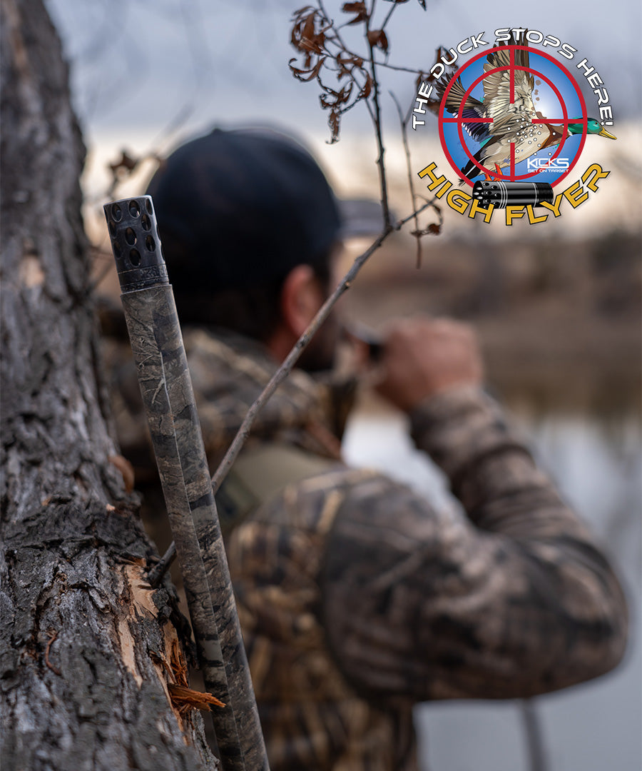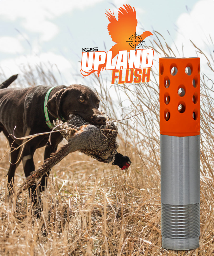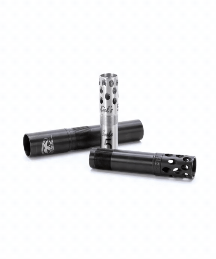 KICK’S chokes are diagonally ported at a 135° angle away from the shooter, which reduces the side blast which is common with other types of porting. Because of the sharp angle of the ports, the leading edge acts as a braking system, slowing the wad down in order to provide superior patterning.