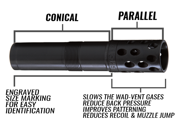 All KICK’S chokes have a unique combination of conical and parallel sections. The conical section is where the choking happens. The parallel section is where the wad-stripping action occurs as the shot returns to a straight path. Plus, there’s no wrench required for installation or removal.